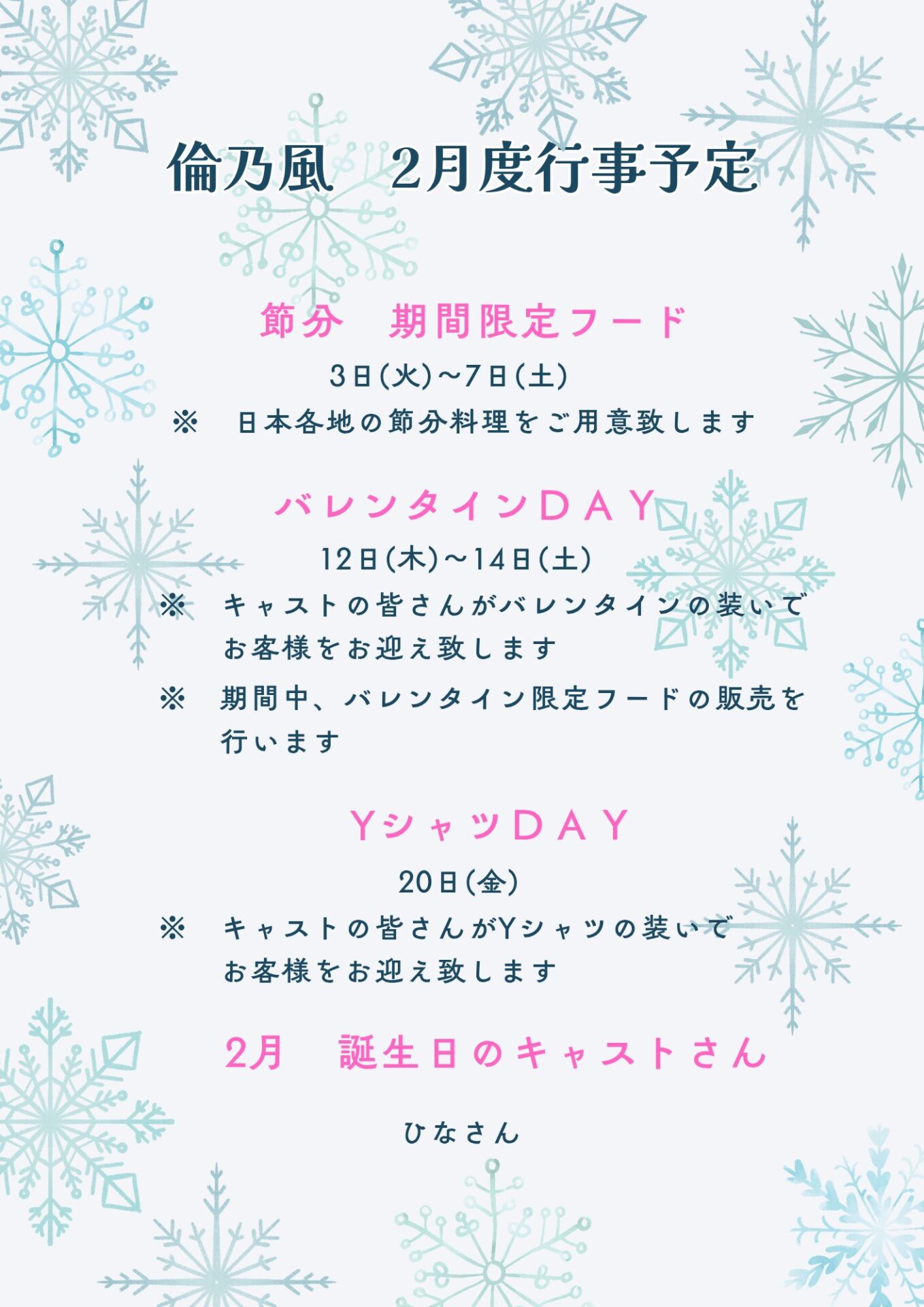 <新宿・倫乃風>2月イベントのお知らせ 2026.01.31 RIN-NO-KAZE Post Share Pin it <新宿・クラブセレネ>2月イベントのお知らせ 前の記事 <立川・シスタールナ>2月のイベントのお知らせ 次の記事