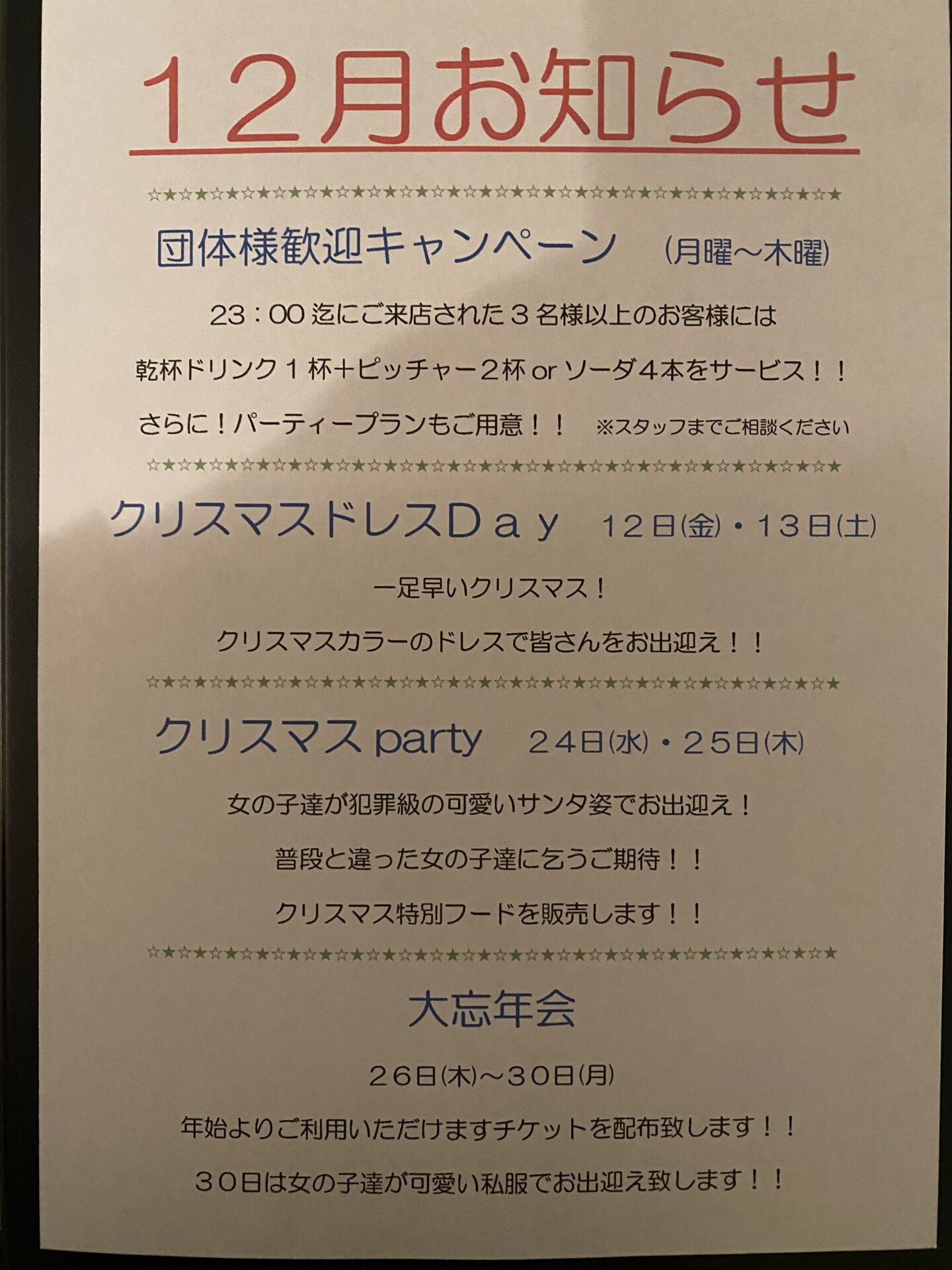 花水岐は今年最後の1ヶ月も楽しく盛り上げてお過ごし頂けるようにイベントをおこないまして、皆さんのご来店を心よりお待ちしております